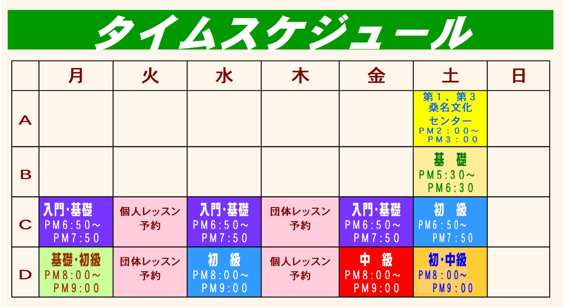 ※全クラス入門者、初心者受講できます!(土曜日PM8:00~の初中級クラス及び個人・予約レッスンは不可)